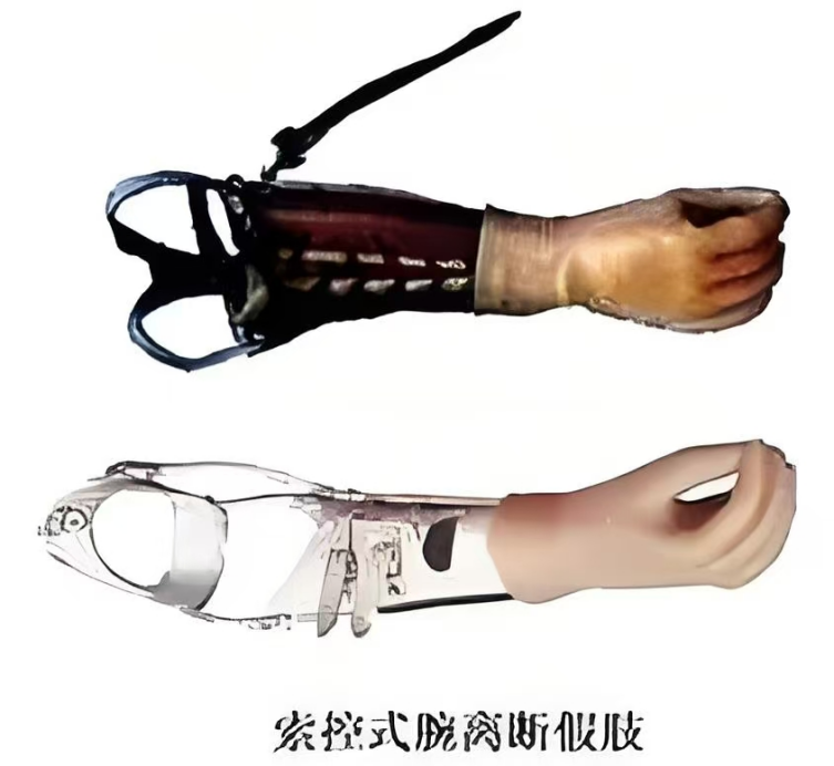 属于功能性假肢,由拉索控制的假手、接受腔和控制手开合的牵引索构成。这种假肢通过外壁筒相连,提供逼真的形态和简单抓握功能。