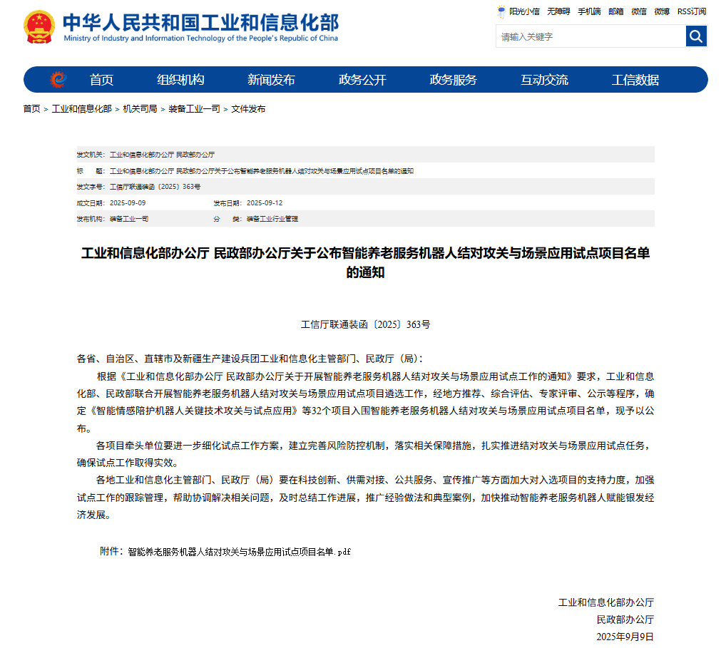 近日,工业和信息化部办公厅与民政部办公厅联合发布《关于公布智能养老服务机器人结对攻关与场景应用试点项目名单的通知》(工信厅联通装函〔2025〕363号),湖北省康复辅具技术中心联合申报的《移乘转运和二便护理床式机器人研发与试点应用》项目成功入选,成为湖北省唯一入选项目。