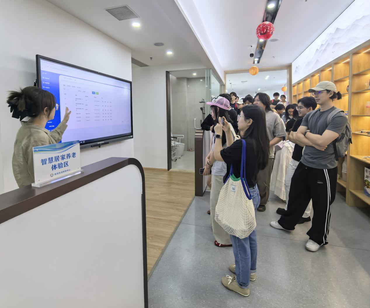 见习期间,师生们深入各个功能区,近距离观察体验智能康复辅具设备设施,探究其人性化设计逻辑与科技感呈现方式;在智慧居家养老体验区,通过工作人员的讲解演示,亲身感受全屋语音智能系统的场景化应用与生态联动优势。大家通过实景空间走查、尺寸测量及功能体验,系统掌握了适老化家具的功能整合与空间适配性设计要点,有效实现了理论与实践的深度融合。